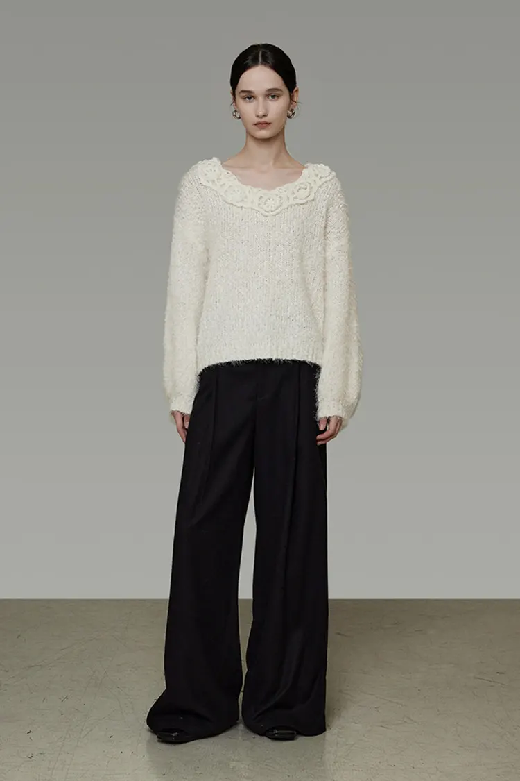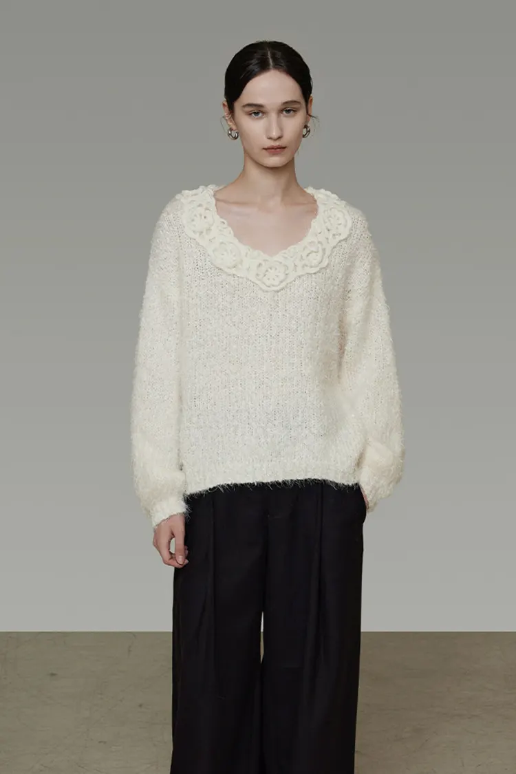 O suéter feminino de renda 3D apresenta um design com decote em V profundo. A borda do decote é adornada com requintadas rendas bordadas, complementadas por pequenos botões de tecido do mesmo tecido. O artesanato de renda tridimensional é claramente em camadas, com detalhes delicados e suaves. A aparência geral é doce, romântica e ainda assim elegante. Seja visto de frente ou de trás, possui um forte senso de design, permitindo que o suéter básico de cor sólida rompa com a monotonia e melhore sem esforço a sofisticação do look. É altamente indicado para consumidores que valorizam detalhes e textura.
