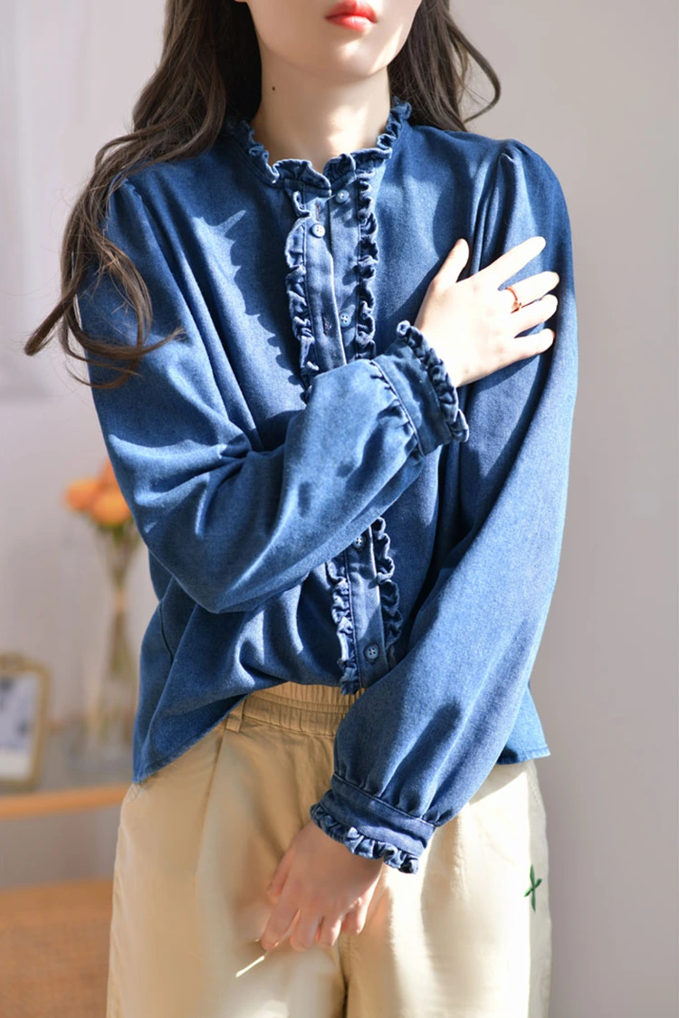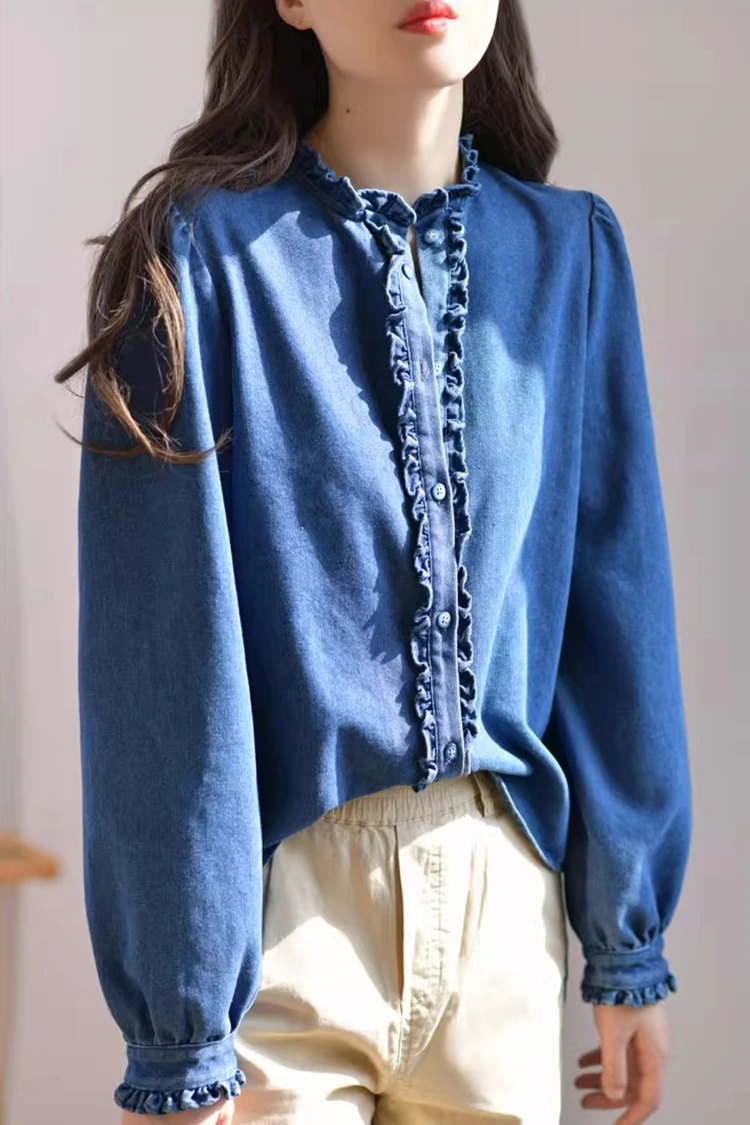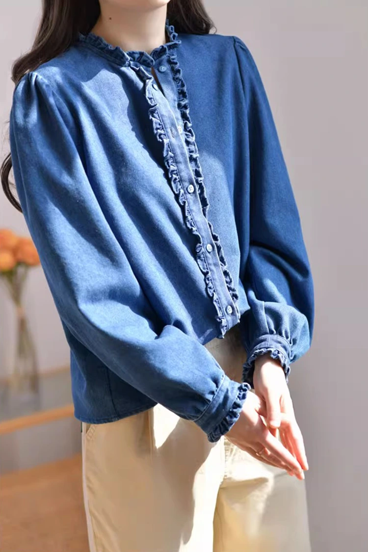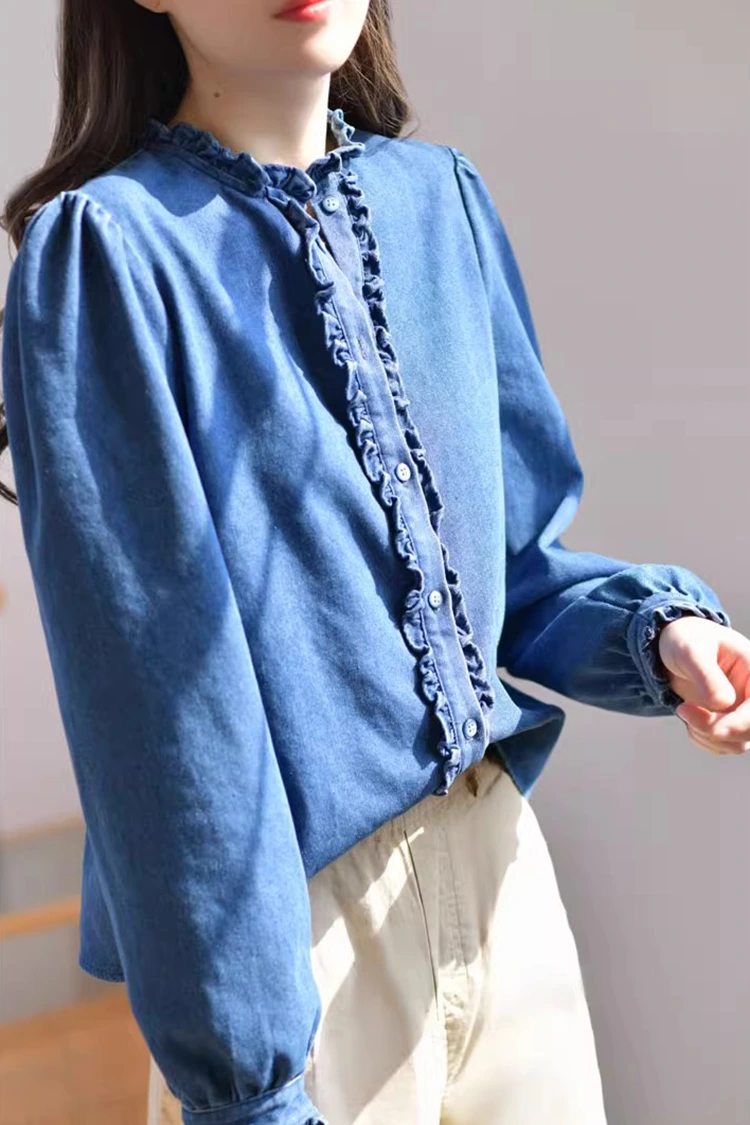 A blusa casual jeans feminina adota um design de padrão retrô e casual, ajustando-se com precisão ao formato do corpo feminino. Não depende do tipo de corpo e pode não só refinar as linhas dos ombros e pescoço, mas também esconder o excesso de gordura na cintura e no abdômen. Atende às necessidades de diferentes tipos de corpo. A gola é projetada como uma gola alta, combinada com bordas requintadas com babados. A abertura frontal e os punhos também são decorados com delicados babados nas bordas. Combinado com as mangas compridas fofas e em formato de lanterna, combina perfeitamente a elegância retrô e a facilidade casual. O padrão simples de cor sólida é clássico e durável e não sai de moda. Pode criar um look casual diário ou um estilo empresarial simples e é altamente prático.