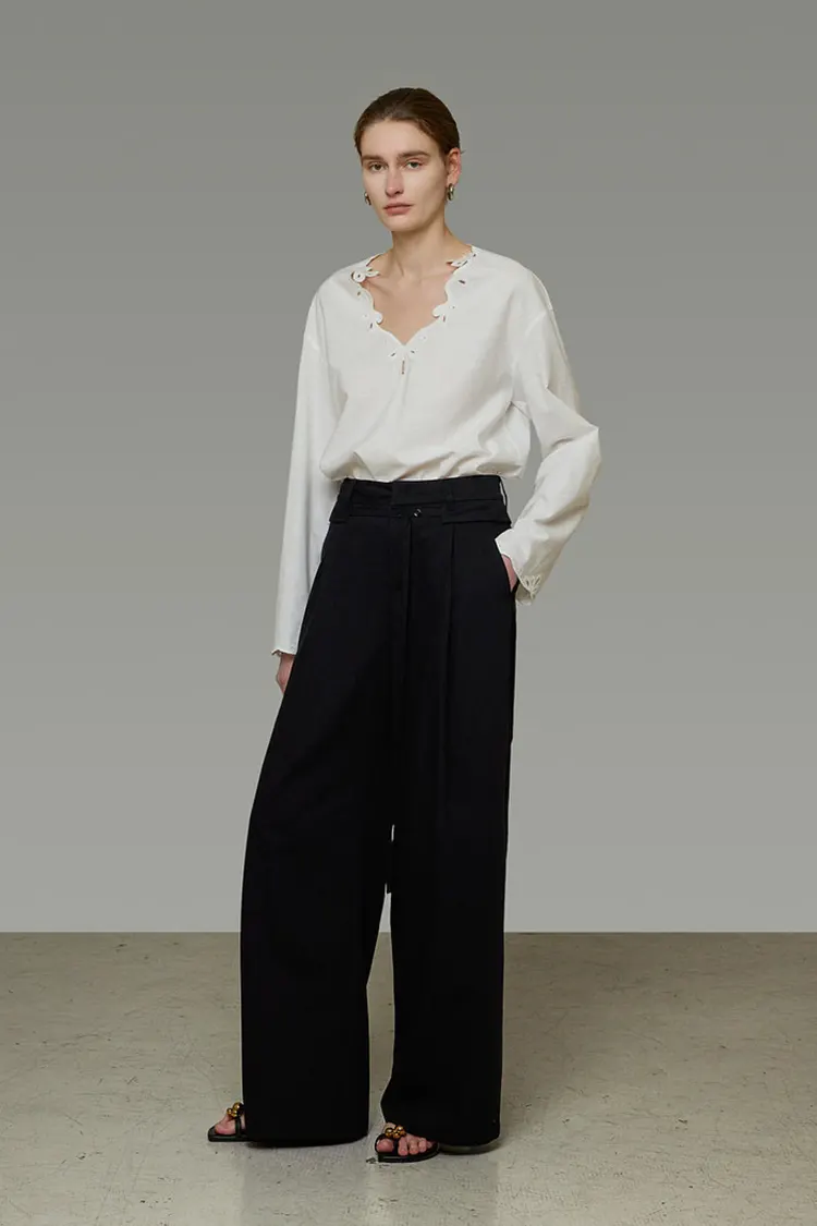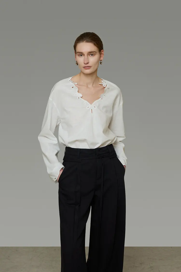 A textura natural do tecido complementa os detalhes do recorte bordado, refletindo plenamente a rigorosa seleção de materiais e artesanato da marca.